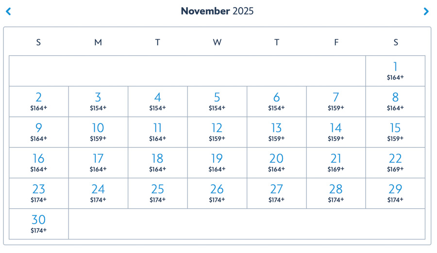 The week of Thanksgiving is typically a pretty popular time to visit the parks, with Thanksgiving Day being no exception. On November 27th, 2025 (Thanksgiving), it’ll cost you $199 to visit Magic Kingdom, $189 for EPCOT, $194 for Hollywood Studios, and $174 for Animal Kingdom.