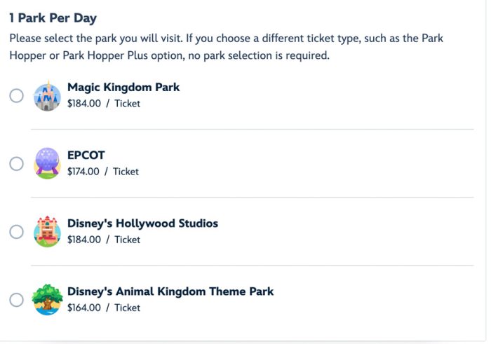 On December 16th — the week just before Christmas, so not quite as busy as Christmas based on these prices — it will cost $184 to visit Magic Kingdom, $174 for EPCOT, $184 for Hollywood Studios, and $164 for Animal Kingdom.