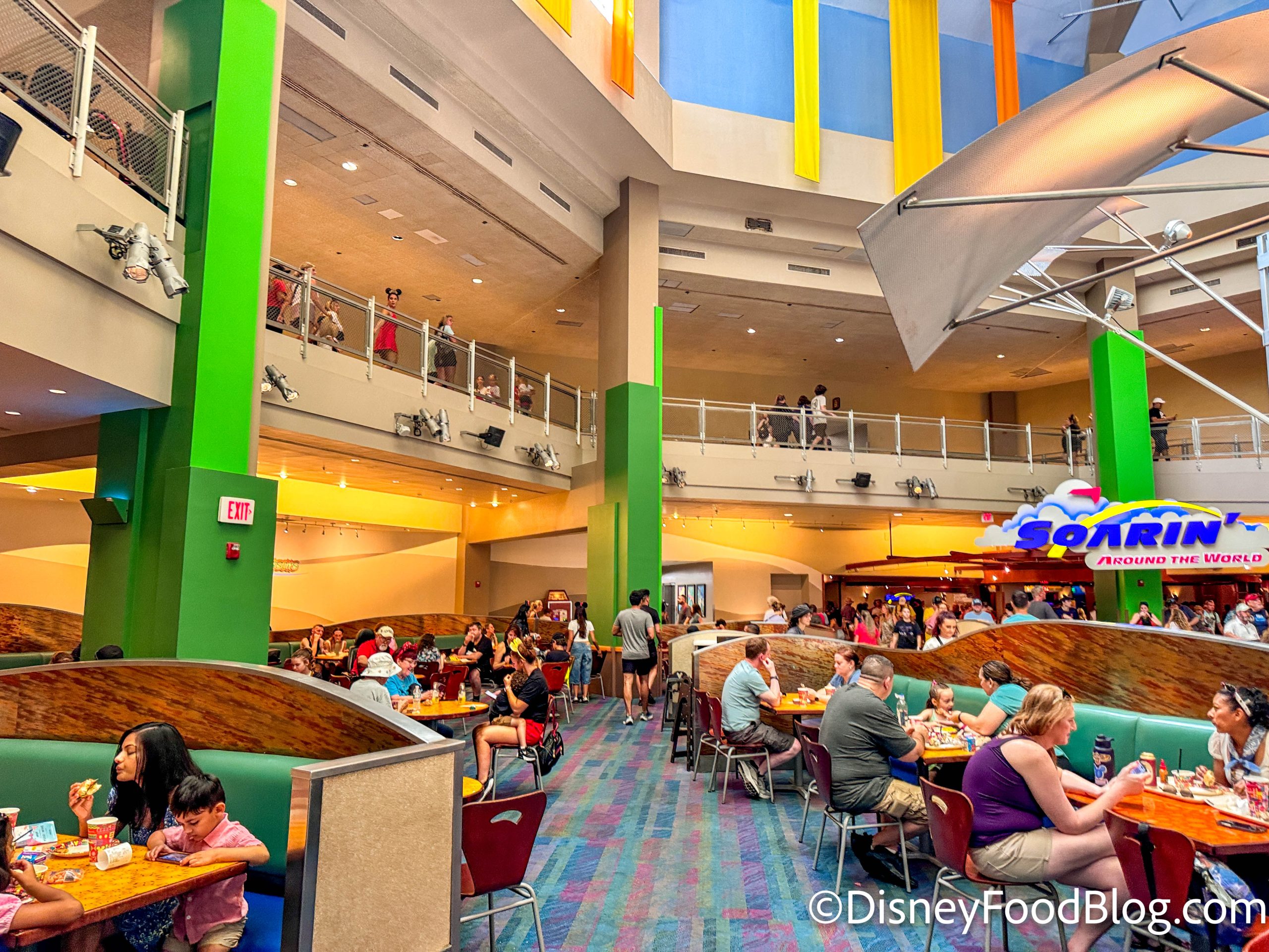 The seating area across from the restaurant between Soarin’ and Living With the Land is usually the emptiest, so this is typically my favorite place to sit when I dine here.