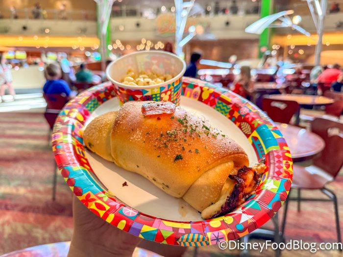 Rolled inside the dough was mozzarella cheese, sauce, and pepperoni. Most of the pepperoni was concentrated in the middle of the roll, so the ends were a little less exciting, but this is a fun and unique way to eat pizza, and I enjoyed it more than I’ve enjoyed some of the round personal pizzas I’ve had in the parks. The pepperoni was savory and meaty, the sauce had a nice tomato tang, and the cheese was plentiful. My only complaint is that this can be a smidge greasy.