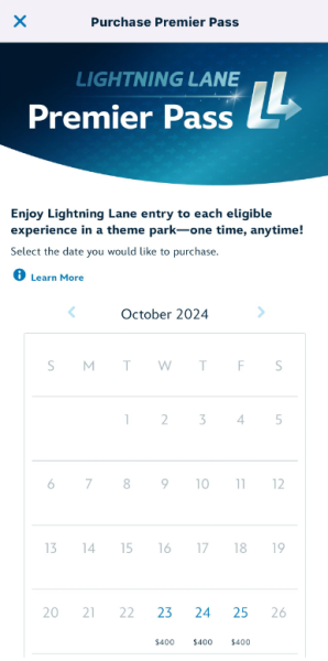 You’ll then get a calendar for the days you can purchase Premier Pass for. You can purchase it up to two days in advance. Choose the date you’ll be buying it for. We chose today, October 23rd.