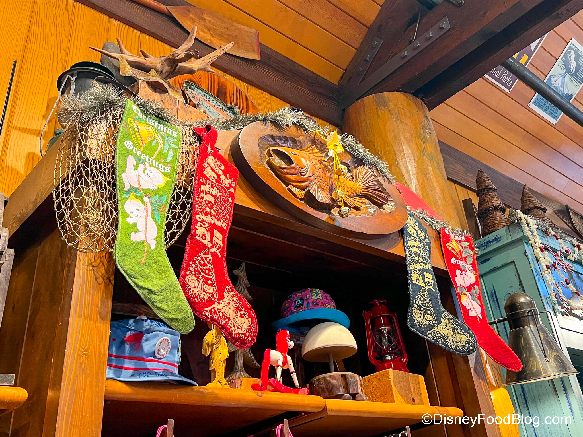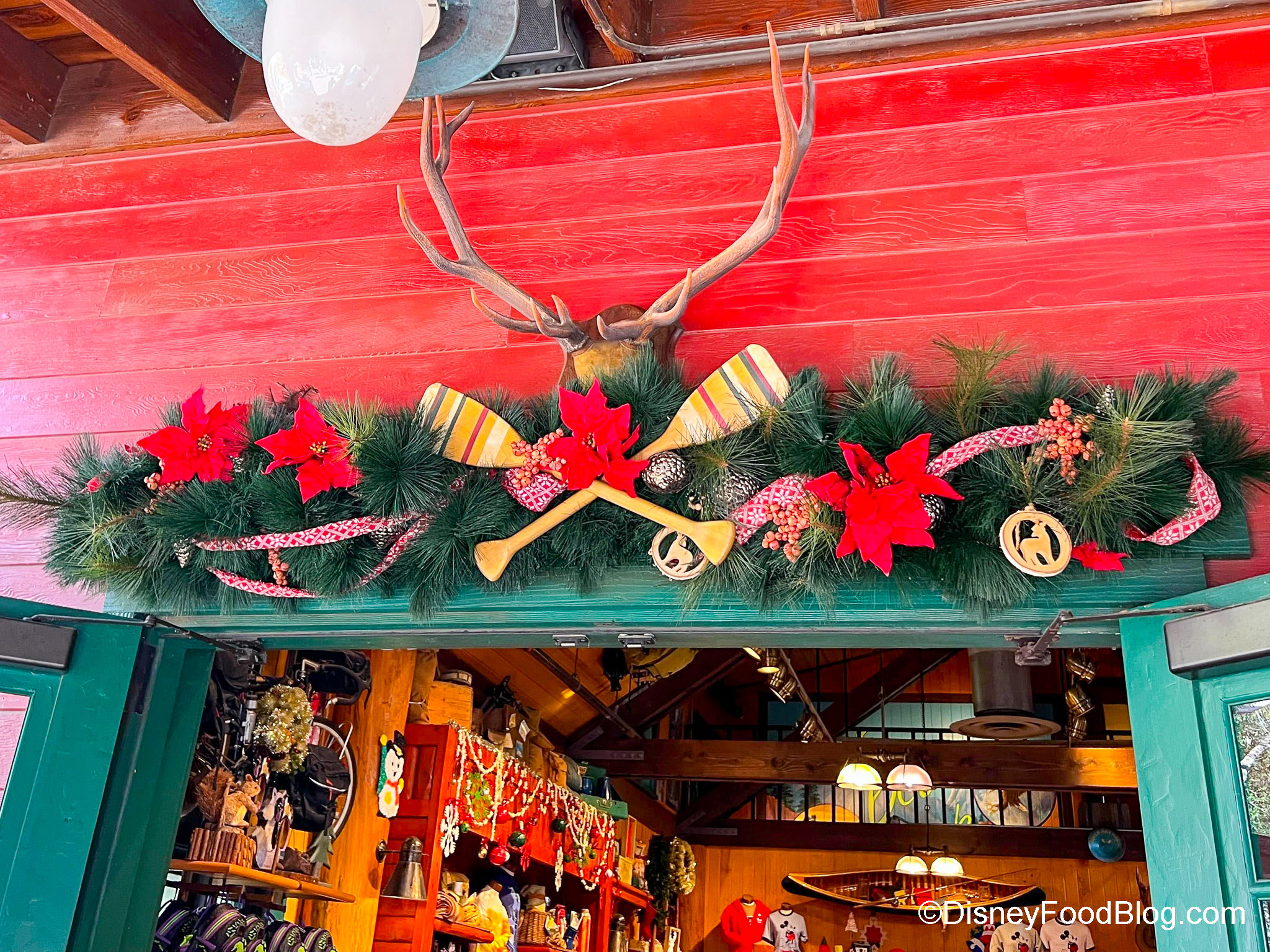 We also saw Christmas decor in California Adventure at the Rushin’ River store. There’s some pretty holiday greenery above the store’s entrance.