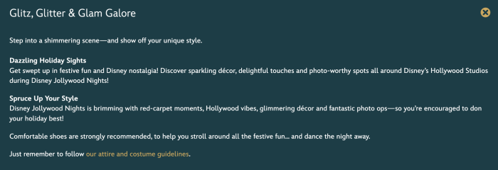 The Jollywood Nights event page includes a warning that reminds guests that comfortable shoes are strongly recommended! The site reads, “Comfortable shoes are strongly recommended, to help you stroll around all the festive fun… and dance the night away.”