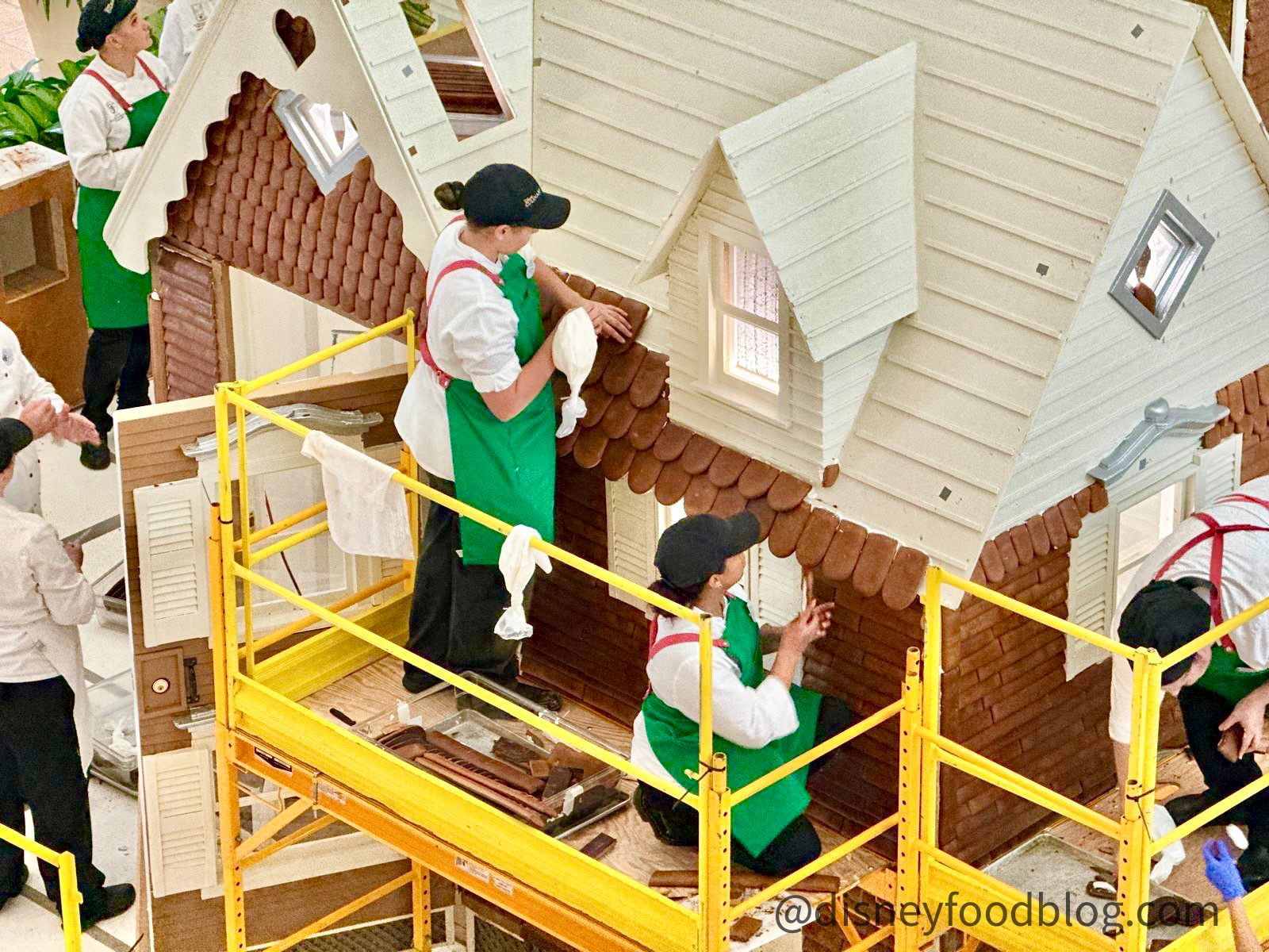 The house is made up of more than 10,000 pieces of gingerbread, many of them baked into the shape of the “shingles” you see being attached here.