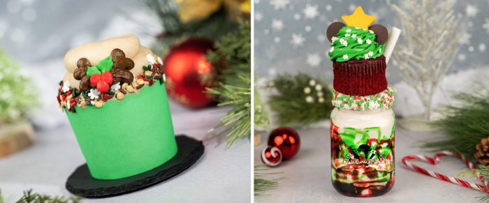 - Holiday Mickey Cupcake: Vanilla cupcake, white chocolate mousse, colored buttercream, holiday sprinkles, and white chocolate candy cane (New)