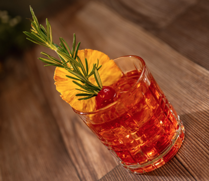 - Holiday Fruitcake Old Fashioned: Uncle Nearest 1884 Small Batch Whiskey, Hella Cocktail Co. Apple Blossom Bitters, cranberry, lemon, and rosemary