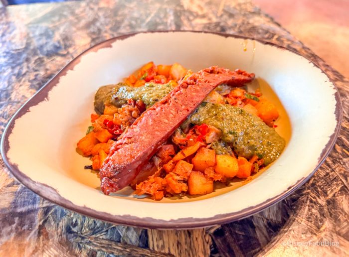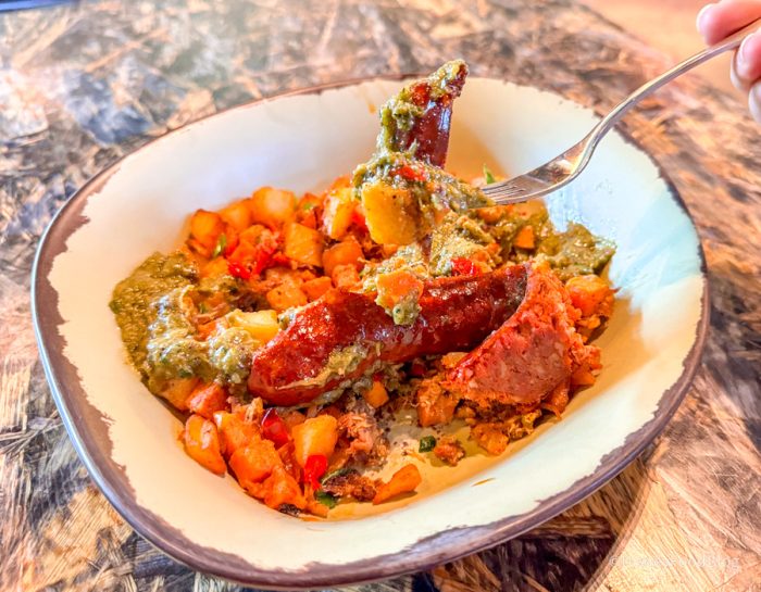 The roasted pork shoulder is mixed into the hash, and it’s incredibly rich, tender, and pairs nicely with the potato hash. The piece of chorizo sausage you get is HUGE — you’ll definitely need a knife for this thing. It’s fairly spicy — a bit hotter than what we typically see with Disney’s spice level — so keep that in mind if you’re averse. Unfortunately, we found a piece of bone in our sausage, but overall we really enjoyed this dish.
