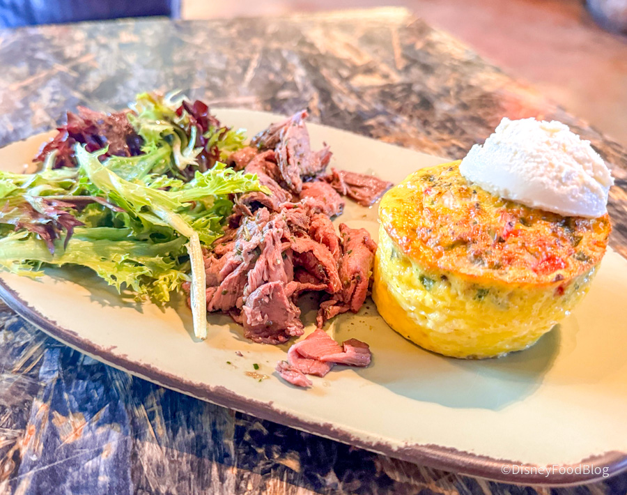 We also grabbed the Frittata and Beef for $14.29. This is a Vegetable-Goat Cheese Frittata with Wood-fired Beef tossed in Chimichurri sauce. This was another hit for us back in the day — and this time around