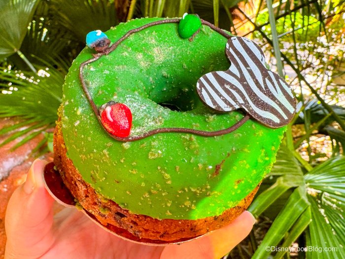First up, we’re heading to Disney’s Animal Kingdom Lodge to visit The Mara to try the Festive Tart for $6.49. It’s a Vanilla Tart Shell with Banana Cake, Caramel Sauce, Matcha Crunch, Chai Mousse, and Green Magic Shell topped with Holiday Lights and Animal Print Mickey. As you can see, it’s already living up to its festive name.