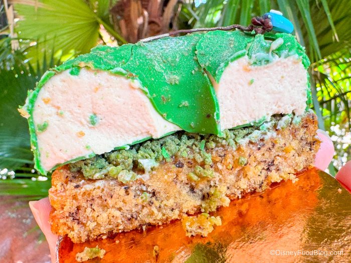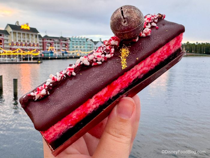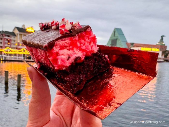 On top, you’ve got this nice thick layer of peppermint cheesecake that’s just like SO good, creamy, and cheesecake-y — it immediately makes us want to start singing Christmas Carols. Then there’s chocolate on top that is sort of hardened like a shell and little peppermint pieces that give you a nice crunch. Y’all — GET THIS SNACK if you want to celebrate the holidays in Disney World.