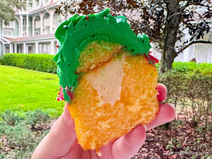 Then we headed over to Disney’s Beach Club Resort to pick up the Holiday Mickey Cupcake at Beach Club Marketplace for $6.49. It’s a Vanilla Cupcake, White Chocolate Mousse, Colored Buttercream, Holiday Sprinkles, and White Chocolate Candy Cane. Okay, so this is basically a regular old Disney cupcake, but its simplicity is actually what we liked about it, although we found the cake a bit dry. It’s a straightforward vanilla flavor with a white chocolate mousse filling that brightens it.