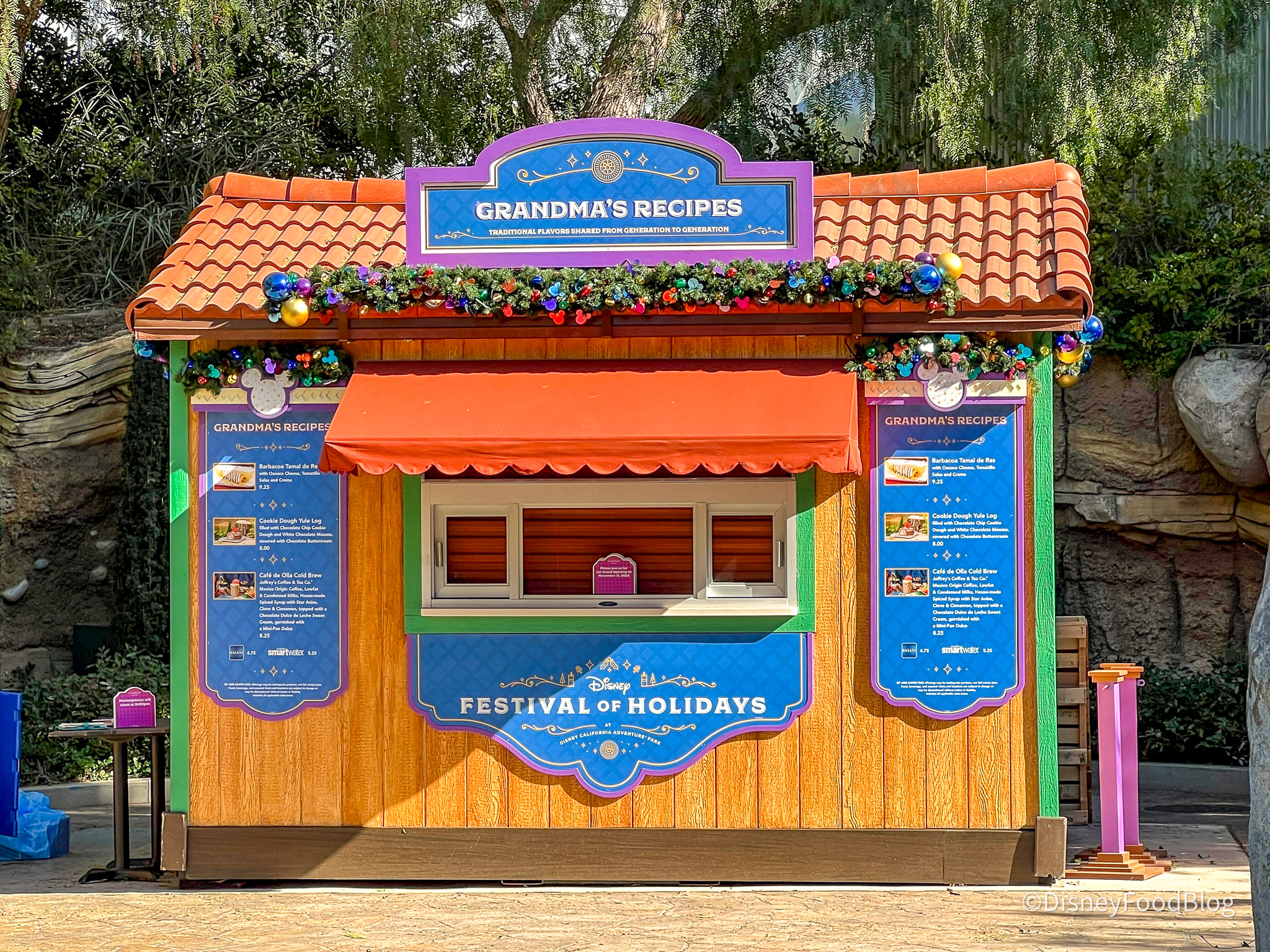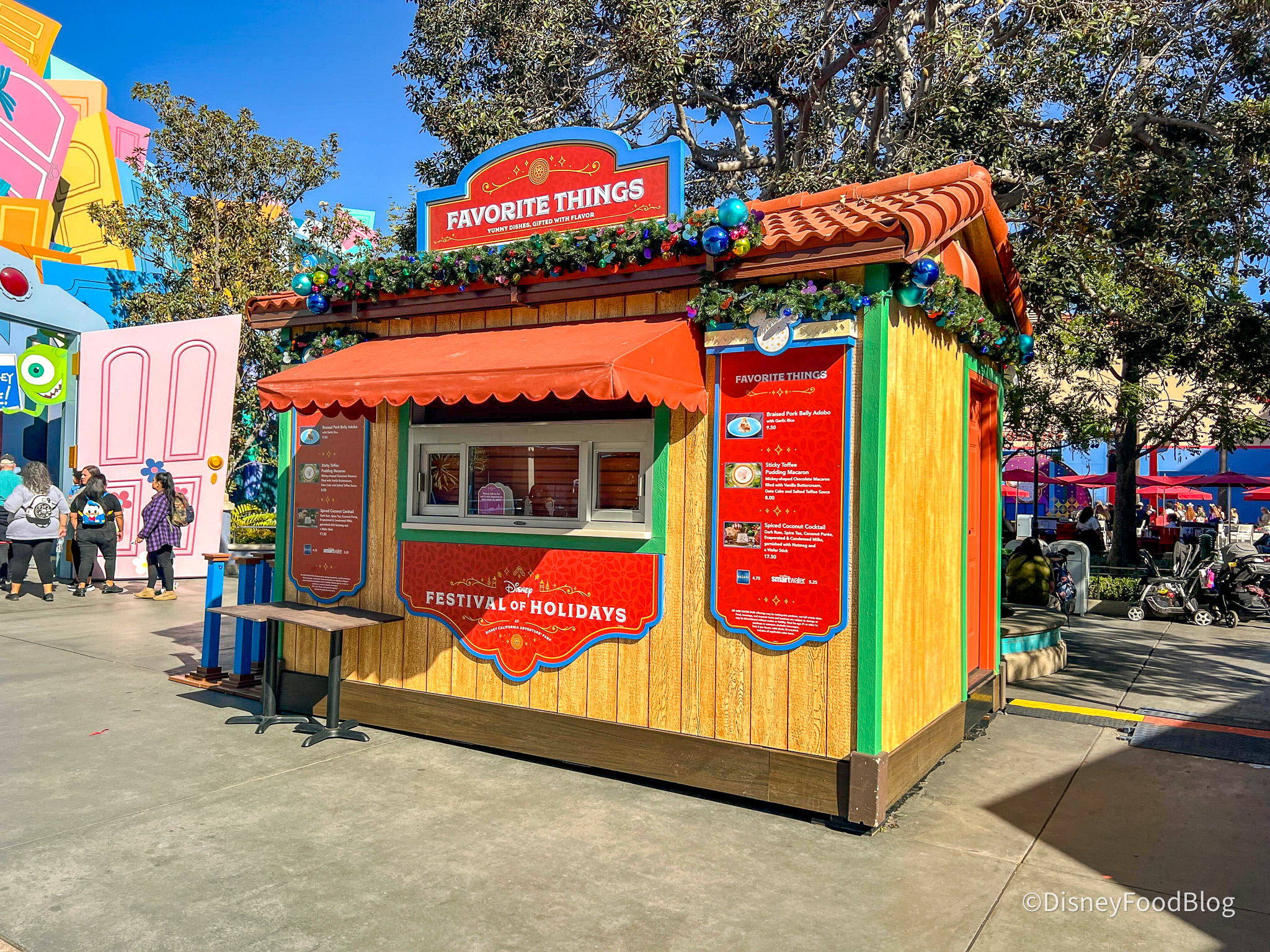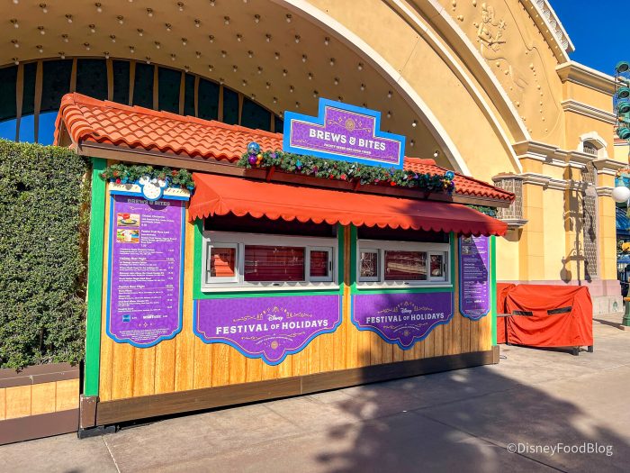 Of course, there’s a very famous International Festival of the Holidays in EPCOT at Disney World, where you can try festive treats from around the world and enjoy the many holiday stories. But there is another holiday festival at Disneyland Resort, as well! Disney Festival of Holidays takes place at Disney California Adventure each year and features some delectable traditional, California-inspired goodies, and it starts SOON! When we stopped by the park the other day, we happened to notice that the park is gearing up for the celebration with several booths and MENUS up so you can start planning your eating.