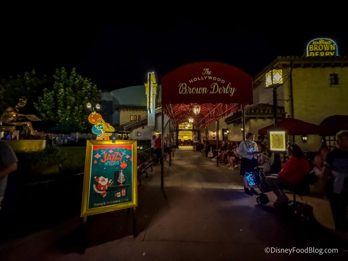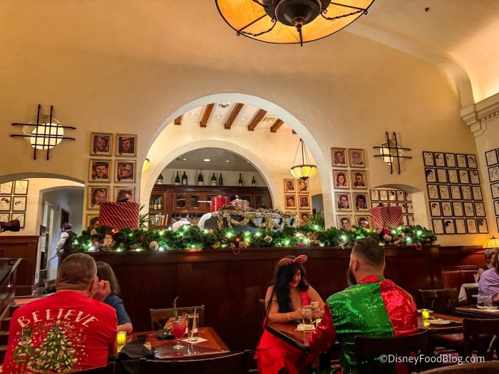 Similar to the regular Hollywood Brown Derby, this restaurant has a more elegant feel to it without being too over-the-top. There’s festive holiday decor all around, and the jazzy music really elevates the scene. The restaurant has various Christmas decorations up including garlands and lights.
