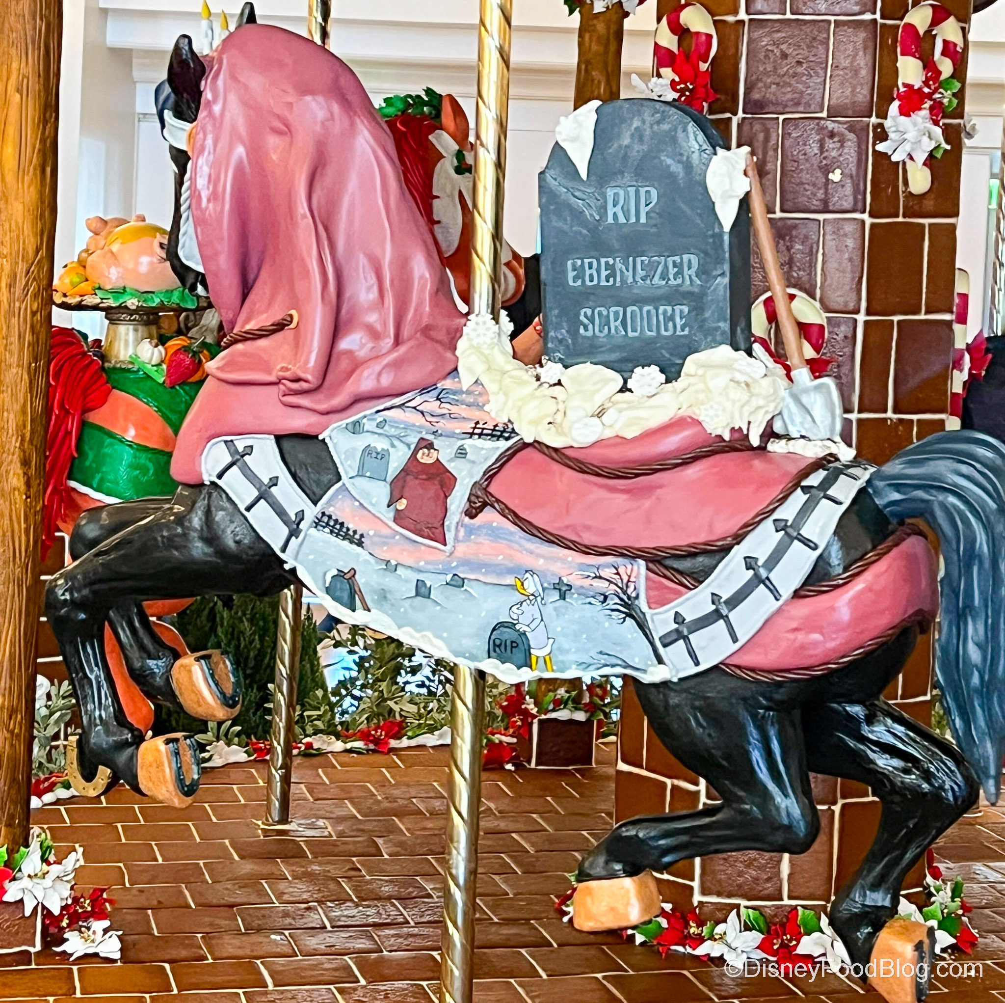 You’ll find the Jacob Marley horse in front of the carousel. Spooky!