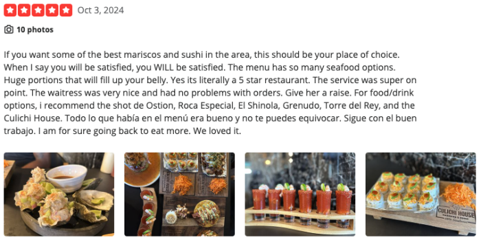 According to the ratings left on Yelp, Culichi House stands at a 4.5 out of 5 stars rating on 19 reviews. Let’s look at two of their most recent reviews.