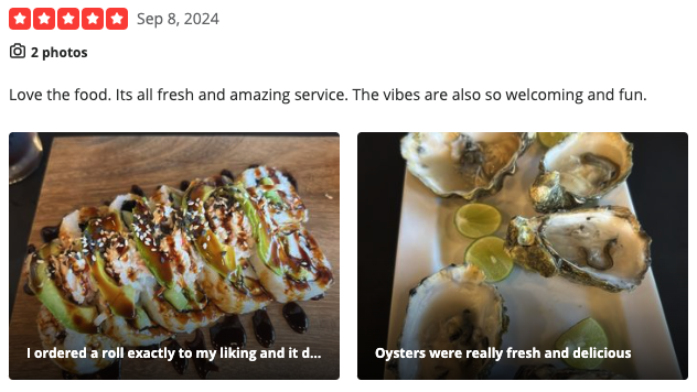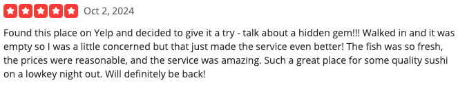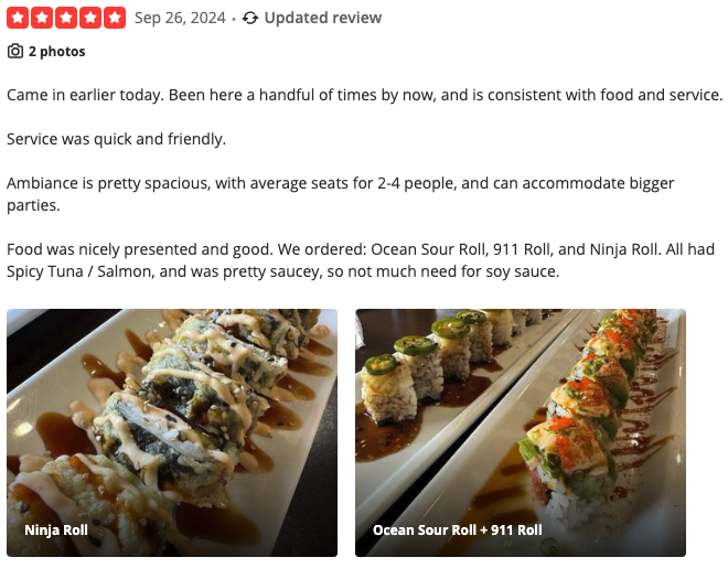 According to the ratings left on Yelp, EXO Sushi stands at a 4.5 out of 5 stars rating on 178 reviews. Let’s look at two of their most recent reviews.