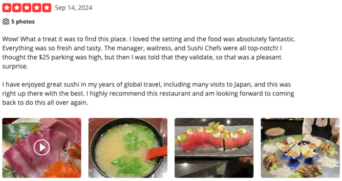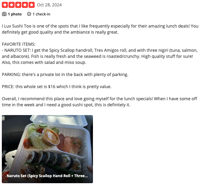 According to the ratings left on Yelp, I Luv Sushi Too stands at a 4.6 out of 5 stars rating on 239 reviews. Let’s look at two of their most recent reviews.