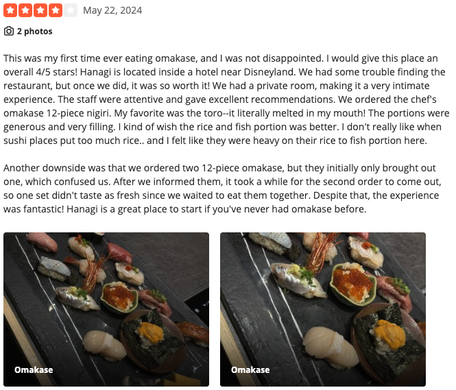 According to the ratings left on Yelp, Hanagi Japanese Restaurant stands at a 4.5 out of 5 stars rating on 158 reviews. Let’s look at two of their most recent reviews.