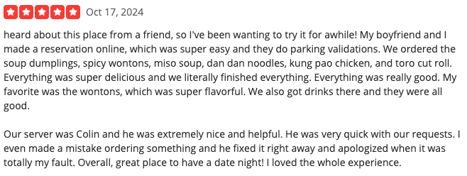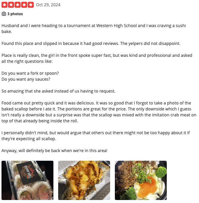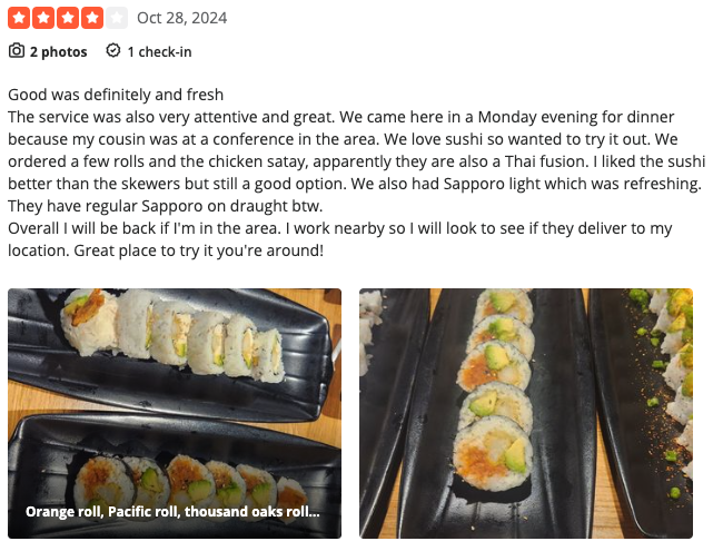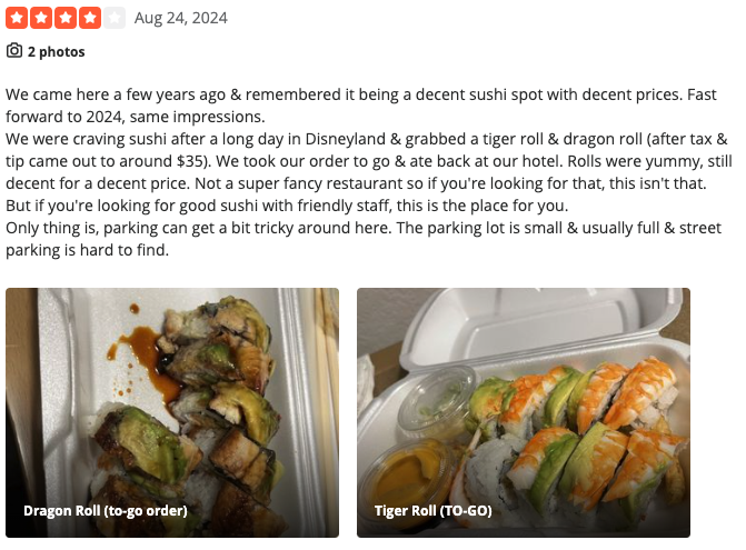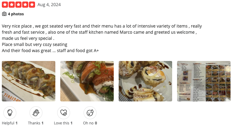 According to the ratings left on Yelp, Orange Roll & Sushi stands at a 4.3 out of 5 stars rating on 1.4k reviews. Let’s look at two of their most recent reviews.