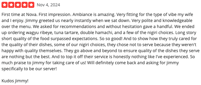 According to the ratings left on Yelp, Nova Kitchen & Bar stands at a 4.6 out of 5 stars rating on 6.4k reviews. Let’s look at two of their most recent reviews.