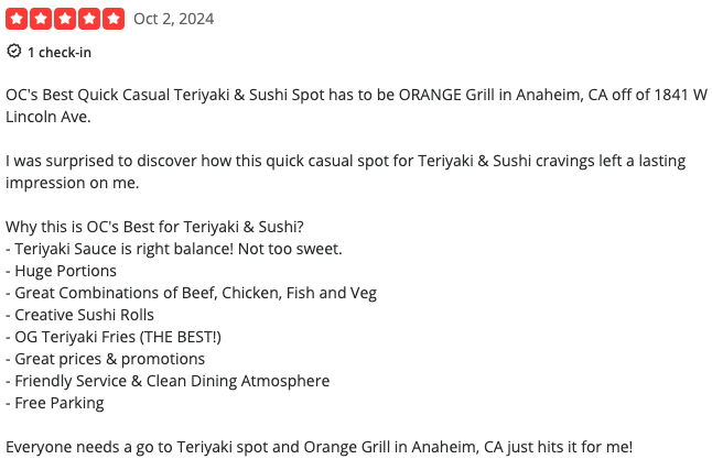 According to the ratings left on Yelp, Orange Grill Teriyaki & Rolls stands at a 4.8 out of 5 stars rating on 49 reviews. Let’s look at two of their most recent reviews.