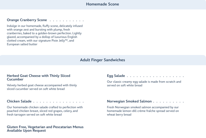 The online menu lists four different adult sandwich options, as well as the orange cranberry scone.