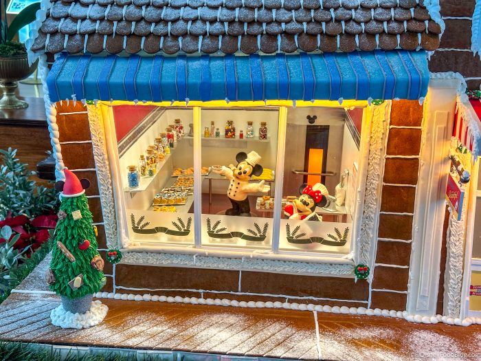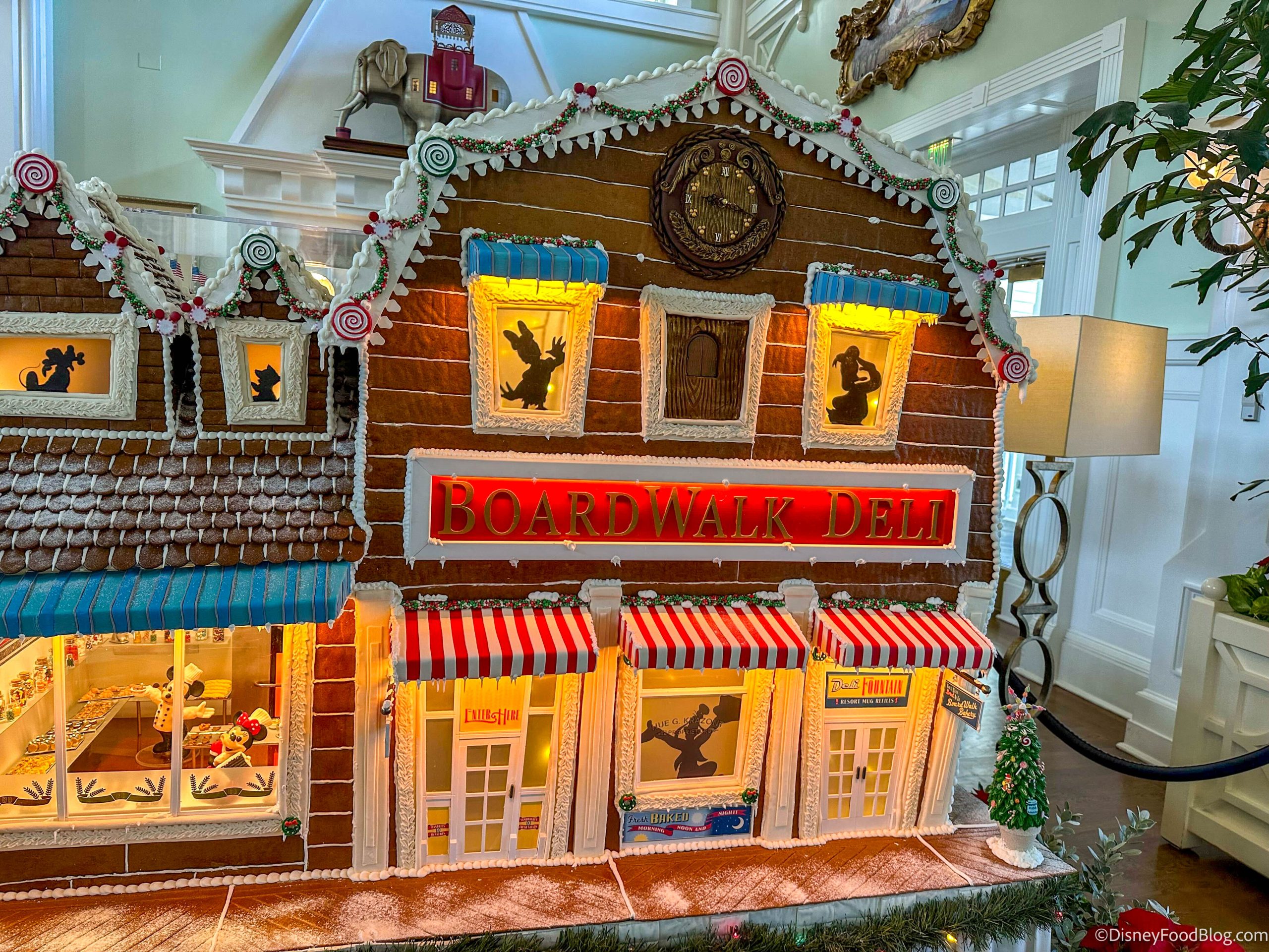The gingerbread model is even made with a matching BoardWalk Deli sign and the iconic red awnings over the windows and doors. And speaking of windows…we spot some Disney pals hiding in them!