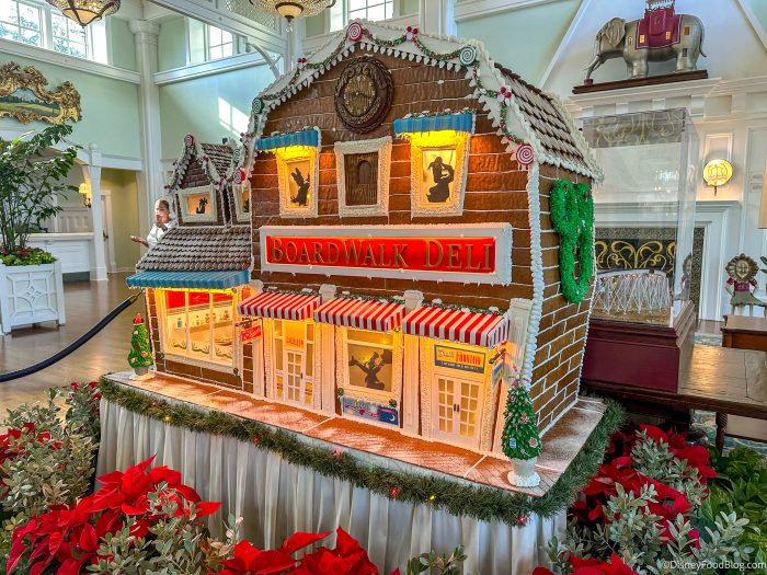 We’ve already checked out the annual gingerbread house display at Disney’s Grand Floridian Resort and the gingerbread castle at the Contemporary, but now we’re heading over to Disney’s BoardWalk to see what they’ve got on display this year!