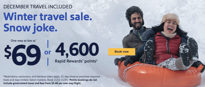 Southwest’s Winter Travel Sale began on November 12th, and deals are available through the 14th. Flights are available for as low as $69, or 4,600 Southwest Rapid Rewards points.