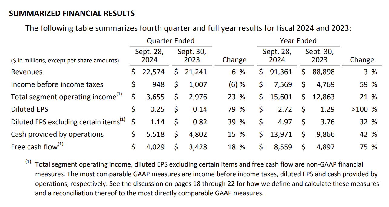 Iger continued his statement, and said, “Our solid performance in the fiscal fourth quarter reflected the success of our strategic efforts to improve quality, innovation, efficiency, and value creation. In Q4 we saw one of the best quarters in the history of our film studio, improved profitability in our streaming businesses, a record-breaking 60 Emmy Awards for the company, the continued power of live sports, and the unveiling of an impressive collection of new projects coming to our Experiences segment. As a result of our strategies and our focus on managing our businesses for both the near- and long-term, we are differentiating ourselves from traditional competitors, leveraging the deepest and broadest set of entertainment assets in the industry to drive attractive returns and further advance our goals.”