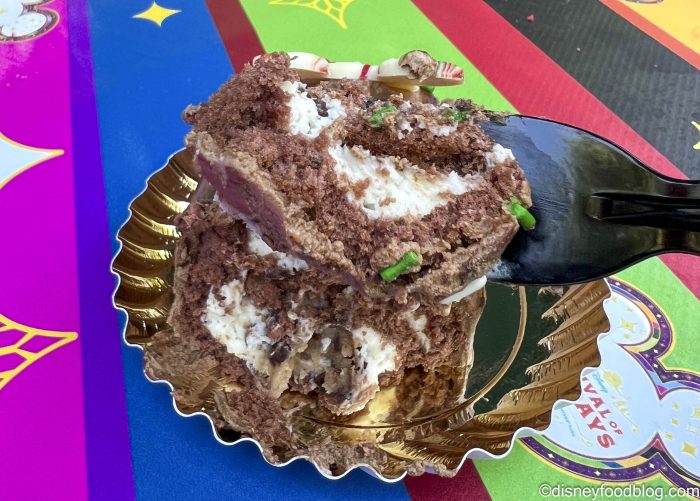 Cookie dough lovers, look out — this one is a match made in holiday heaven for you! The cookie dough in this one really ties everything together. The chocolate in the center wasn’t overpowering, which we were a bit concerned about at first glance. The buttercream used in this one is really soft and cuts down the chocolate flavor. It’s also topped with some festive sprinkles and a white chocolate cookie, which made it feel like a quintessential SoCal holiday treat. It’s also dense enough that we thought it could pass for a shareable snack, and we can’t wait to grab it again and share it with a friend!