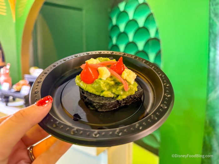 We were able to try a few of the eats and drinks available throughout Universal Orlando as part of the Wicked event as well, starting with the Ozvocado Toast! This is an artisan-style black bread with smashed avocado, sweety drop peppers, pickled onions, and feta cheese.