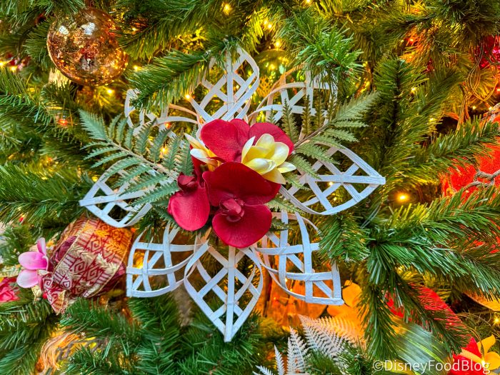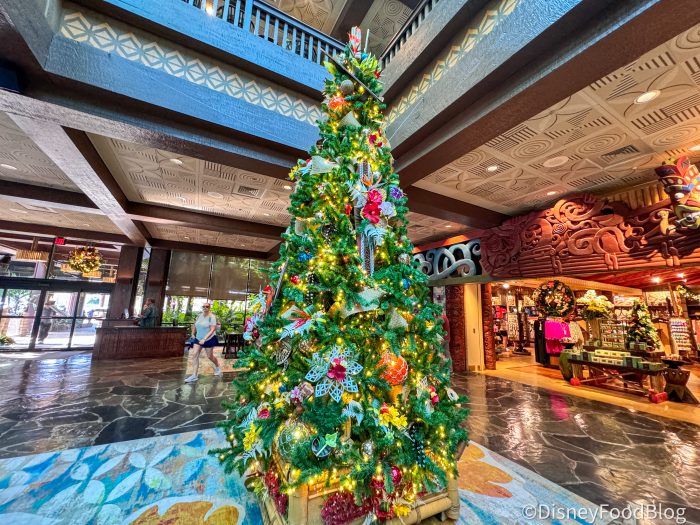 First up on our list is Disney’s Polynesian Village Resort! You’ll find this hotel’s tree in the Great Ceremonial House, a.k.a. the main lobby.