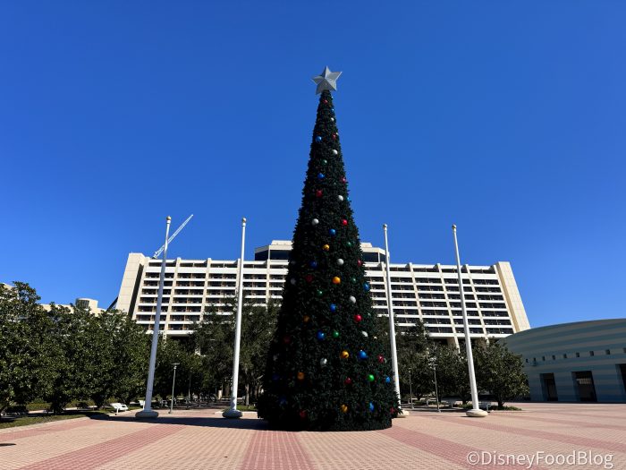 You can take a quick peek at it as you’re coming around the monorail, but you can’t truly appreciate the scale until you’re at ground level. This gigantic tree is gorgeous and decked out in larger-than-life ornaments and ribbons!
