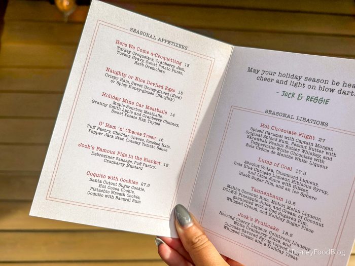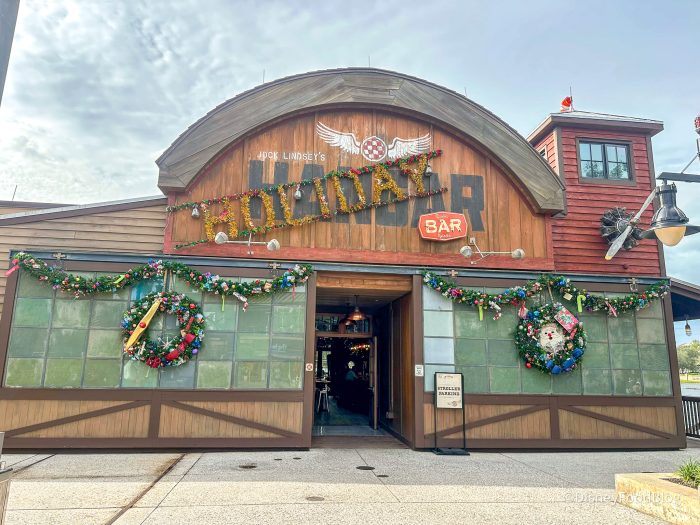Jock Lindsey’s Hangar Bar is a vintage airplane hangar-themed bar in Disney Springs. It’s located at The Landing in Disney World’s shopping and dining district. You’ll find lots of signature cocktails on the menu, along with seasonal appetizers and libations. We stopped by to check out the new holiday offerings, and we hope you enjoy them as much as we did!