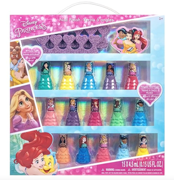 If you’re shopping for a little Disney princess fan, this set of nail polish is perfect. It comes with 15 nail polish bottles, including glittery and opaque colors. Shades include pink, yellow, green, orange, sky blue, dark blue, red, and more.