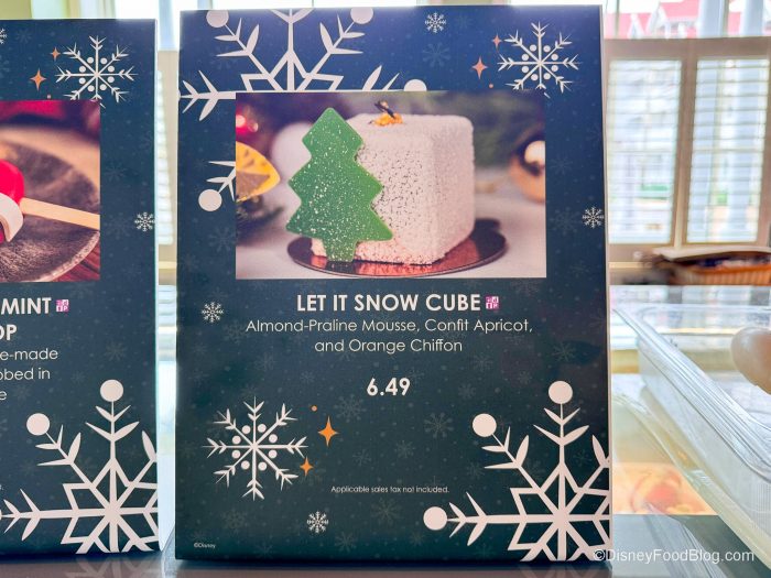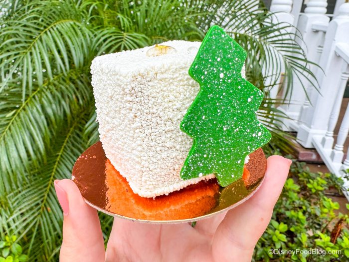 We headed over to Gasparilla Island Grill to try out something called the Let It Snow Cube. It’s a cube made with Almond-Praline Mousse, Confit Apricot, and Orange Chiffon for $6.49. There’s also a little Christmas tree on it.
