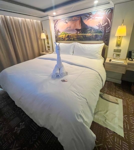 Here’s a look at the bed in the suite. Look at the cute towel animal on the bed! It’s a giraffe! Also, we’re impressed because making a giraffe out of a towel CAN’T be easy! The overall colors of the room are neutrals, too, which are reminiscent of The Lion King.