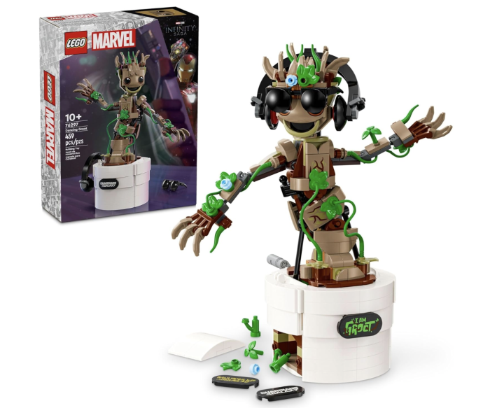 I am Groot! This Groot LEGO set is 20% off and includes a buildable Groot in a flower pot, three different nameplates to attach to the pot, and accessories like headphones, sunglasses, and extra leaves.