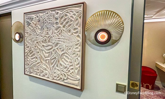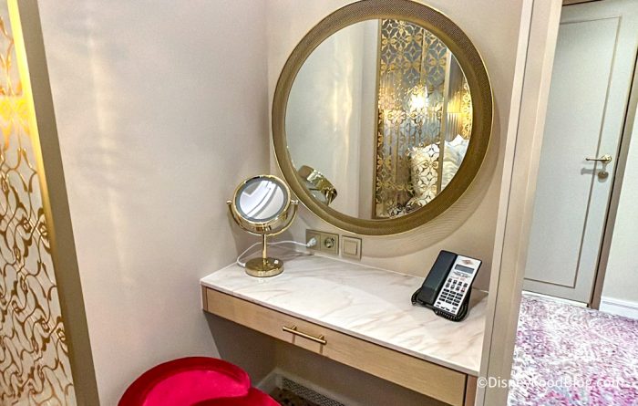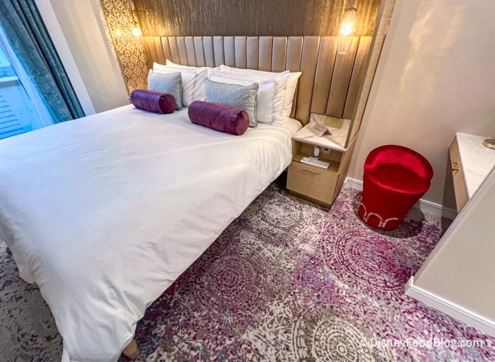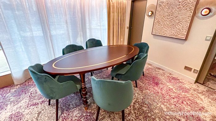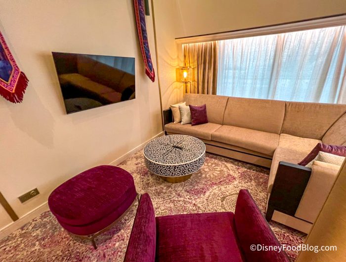 Here’s a look at the common space to really give you an idea of the design style throughout the suite. You’ll find rich jewel tones, ornate decorations, and nods to Aladdin.