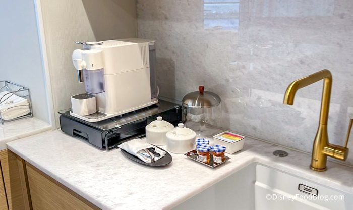 Nearby, the kitchen has coffee, tea, and even some little jam! This is a great spot to grab a quick bite for breakfast before exploring the ship.