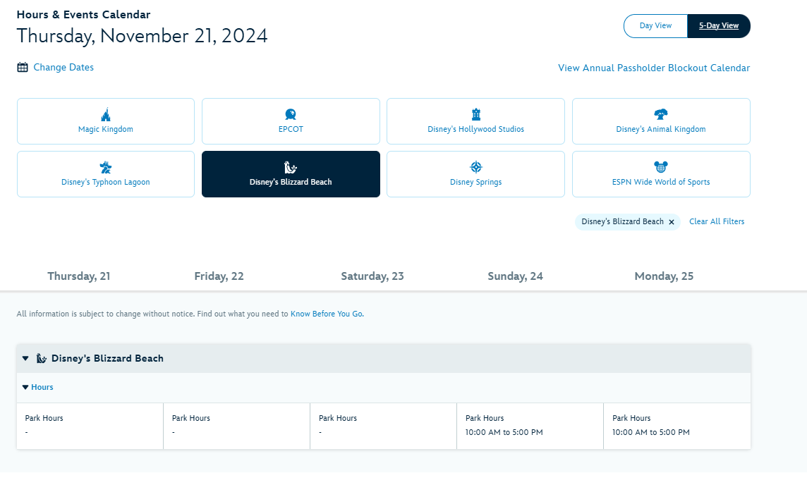 Due to cold weather, Blizzard Beach will be closed from Thursday, November 21st through Saturday, November 23rd. As of now, the Disney World calendar shows the park reopening on Sunday, November 24th, but we’ll let you know if that changes. Make sure you double-check the Disney website or My Disney Experience app for the most updated information about park hours ahead of your visit!