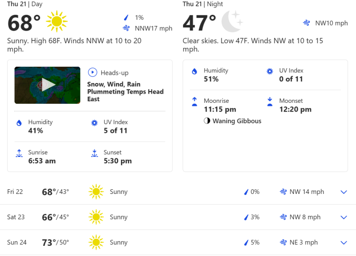 The forecast for November 21st shows a high of 68 degrees and a low of 47 for the Orlando area. On November 22nd, the high is expected to stay at 68 degrees with low temps potentially dropping to 43 degrees. Saturday is forecast to have a high temperature of 66 degrees — so if you’re planning to be in the parks this weekend make sure you pack and dress accordingly!