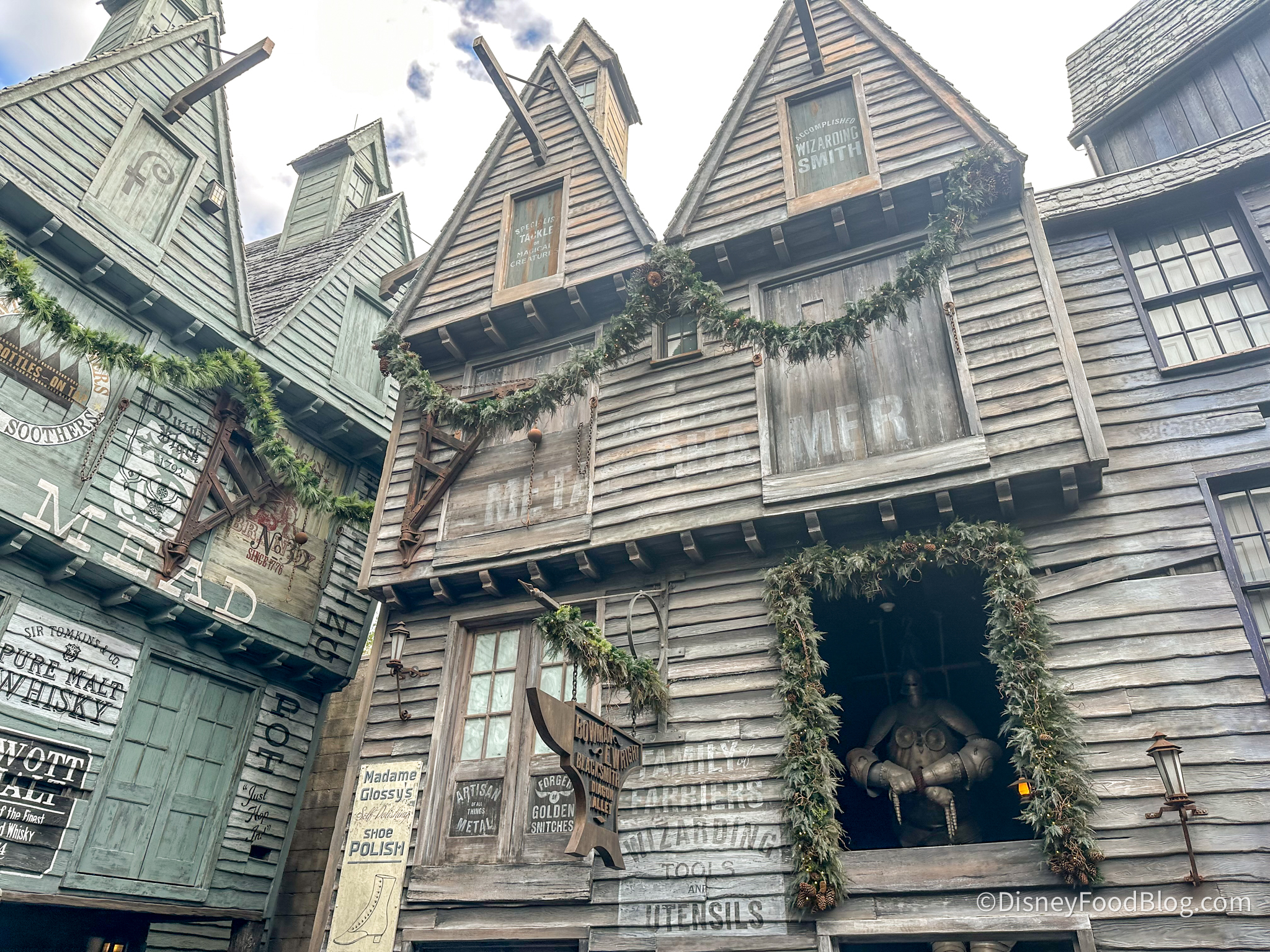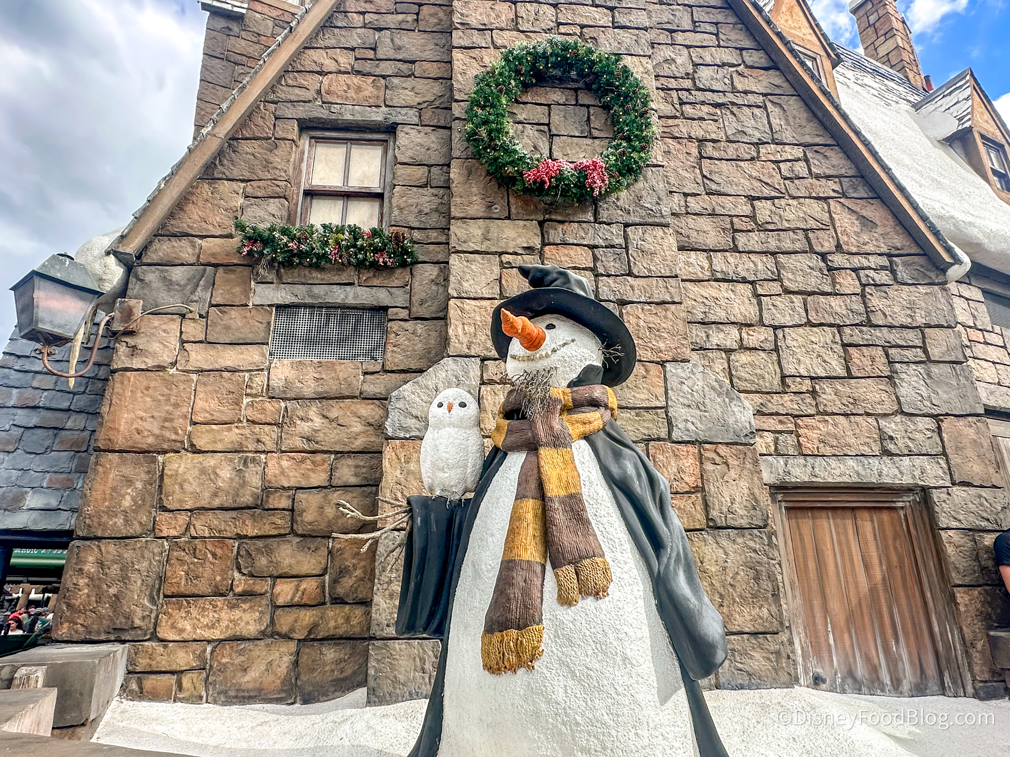 Hogsmeade is decorated for the holiday season with tis festival decor, garland, lights, and more. Plus, you can grab a hot butterbeer on those chilly morning and evenings to warm you up.