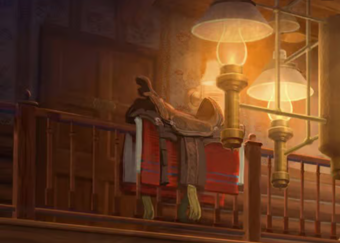 In the upper left of the concept art, we can see a saddle and horse blankets, which would have been what a road-weary traveler would’ve brought into the mile house with them for an overnight stay.