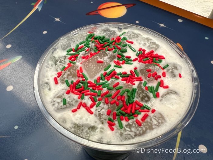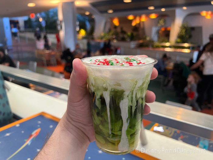 You’re not going to find any alcoholic beverages here, but Alien Pizza Planet does tend to offer interesting seasonal drinks. During our visit, we tried the seasonal Holiday Green Drink! This drink is an apple-flavored beverage topped with caramel cold foam and sprinkles and will set you back $6.99.