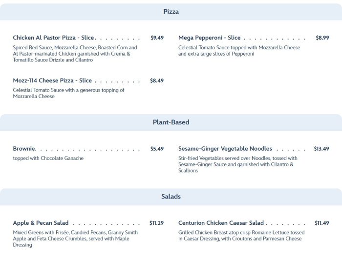 When it comes to the menu, think quick-service pizza parlor. You’ll find several options pertaining to pizza, pasta, and salad. The pizza ranges from typical pepperoni and cheese to seasonal options that can get pretty exciting, like the Chicken Al Pastor Pizza. The pizza here is served in slices for around $8 to $10.