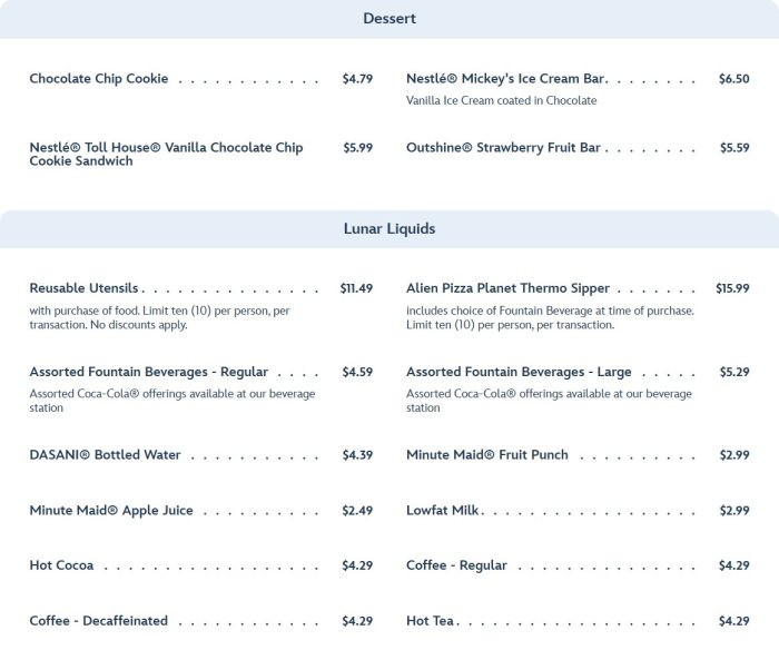 With that said, we can’t help but comment on the prices. While these rates won’t bankrupt you, the items here are clearly overpriced. Comparing Alien Pizza Planet to other similar spots at Disneyland, there are more affordable options that provide equal or better quality, so we’re scratching our heads as to why Alien Pizza Planet refuses to come down in cost. $9 or more for a slice of pizza is tough to swallow.
