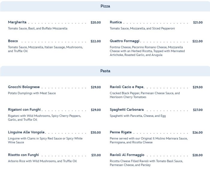 Il Mulino New York Trattoria is located in Walt Disney World’s Swan Hotel, and it serves up traditional meals from the Abruzzi region of Italy. This is the second location for the restaurant, with the original location being in Greenwich Village, New York. Inside, you will find dark wood tones, rustic lighting, and brick walls as you dine on rich, authentic flavors. Let’s head inside!