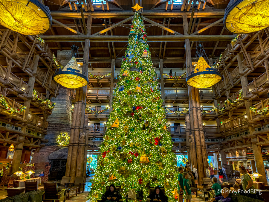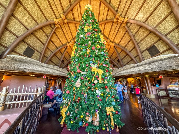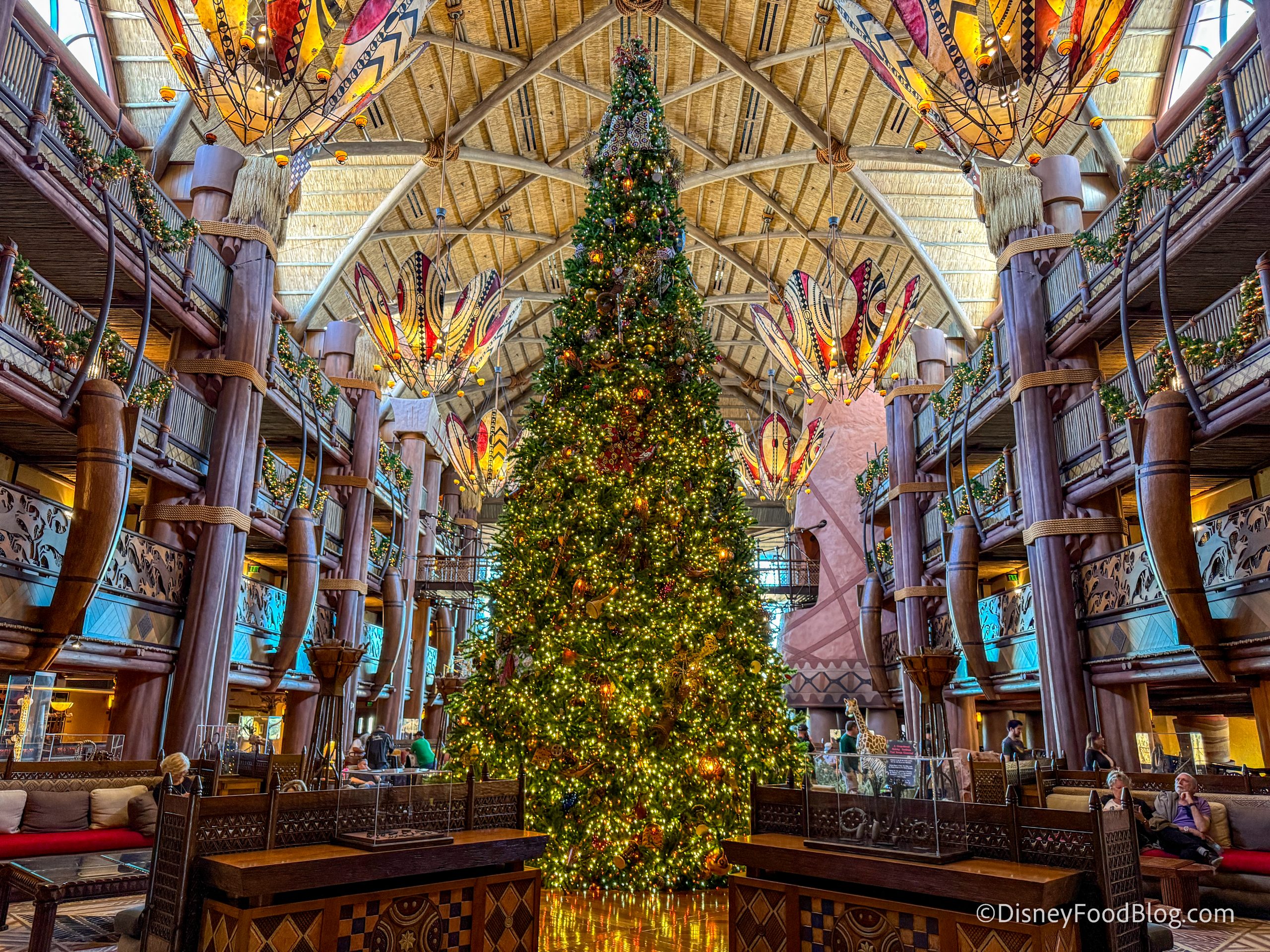 There are actually TWO different Christmas trees up at Animal Kingdom Lodge. The largest one can be found in the lobby of Jambo House, but there is also a beautiful tree up in the lobby of Kidani Village.